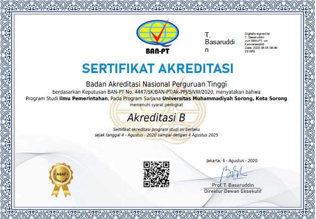 Program Studi Ilmu Pemerintahan Fakultas Ilmu Sosial dan Ilmu Politik Universitas Muhammadiyah Sorong (UNAMIN) merupakan program sarjana (S1) yang telah terakreditasi Baik berdasarkan SK BAN-PT Nomor 4447/SK/BAN-PT/Ak-PPJ/S/VIII/2020 dan memberikan gelar Sarjana Ilmu Pemerintahan (S.IP.) kepada lulusannya. Program Studi beralamat di Jl. Pendidikan No. 27, Kelurahan Klabulu, Distrik Malaimsimsa, Kota Sorong, Papua Barat Daya, dan dapat dihubungi melalui email pemerintahan@um-sorong.ac.id.